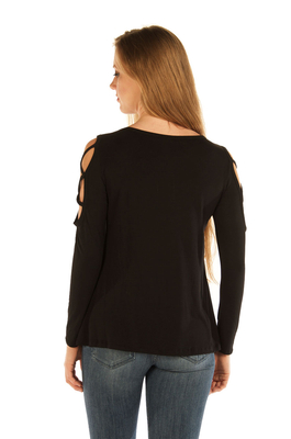 Flirtatious lace-up cold shoulder crew. Rhinestone embellished devilish skull print. She will be a sure to be knock out in this show-stopper.