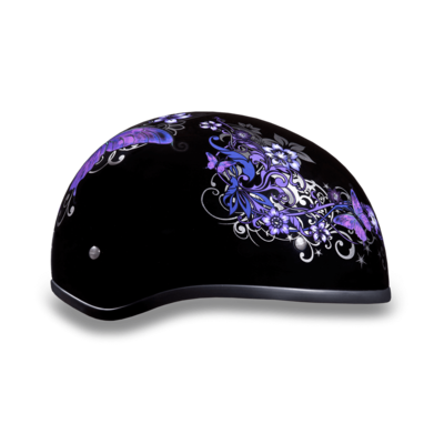 Our D.O.T. Daytona Slim Line Skull Cap 1/2 Shell Helmet In The Butterfly Graphic, Meets And Exceeds D.O.T. FMVSS 218 Standards And Is The Smallest D.O.T. 1/2 Shell Helmet Ever Made!! With 3 Different Shell Sizes, You're Sure To Get That Proportionate Fit!! Each Graphic Item Is Custom Designed And May Vary In Color Or Composition. Available Without Snaps/Visor Only. Many More Colors And Designs Available. Free Head Wrap And Cloth Draw String Bag Included. Sizes Range From 2XS-2XL.