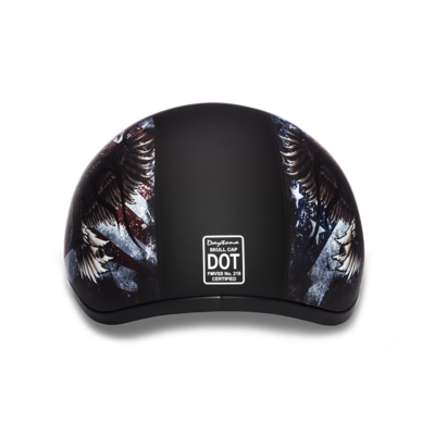 Our D.O.T. Daytona Slim Line Skull Cap 1/2 Shell Helmet In The USA Graphic, Meets And Exceeds D.O.T. FMVSS 218 Standards And Is The Smallest D.O.T. 1/2 Shell Helmet Ever Made!! With 3 Different Shell Sizes, You're Sure To Get That Proportionate Fit!! Each Graphic Item Is Custom Designed And May Vary In Color Or Composition. Available Without Snaps/Visor Only. Many More Colors And Designs Available. Free Head Wrap And Cloth Draw String Bag Included. Sizes Range From 2XS-2XL.