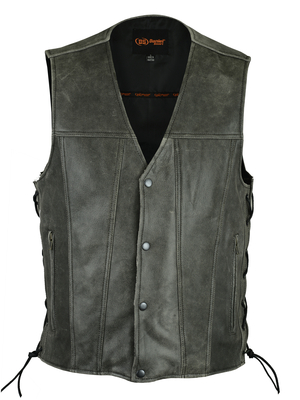 If you want something different than classic black leather, our men's gray side lace concealed carry biker vest is a great choice. Our gray, single-panel vest is made from soft, premium dyed cowhide. It also features a satin liner that's smooth on skin and other garments.