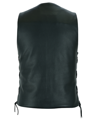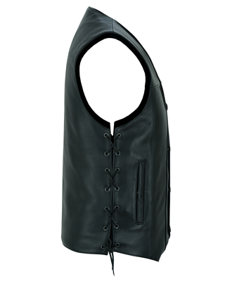 Our men's side lace motorcycle vest is adjustable, so you get the perfect fit for on and off the bike. The side lacing is functional, and it adds spunk to your classic leather vest. The buffalo nickel snaps are unique and will stand out against the black leather and lacing.