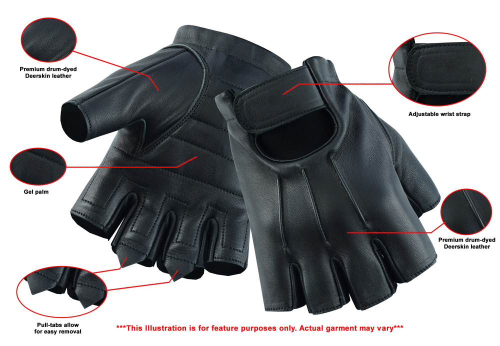 Men’s tough fingerless glove made in premium drum-dyed Deerskin leather. Featuring gel palm for long haul comfort, extended pull-tabs for easy removal, and an adjustable wrist strap.