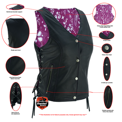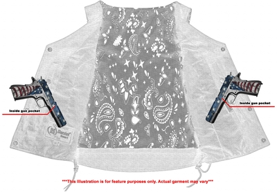 2 inside concealed gun pockets made of special heavy-duty textile with built-in holsters and snap closure.