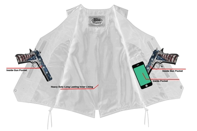 2 inside concealed gun pockets made of special heavy duty textile with built-in holsters and snap closure.
