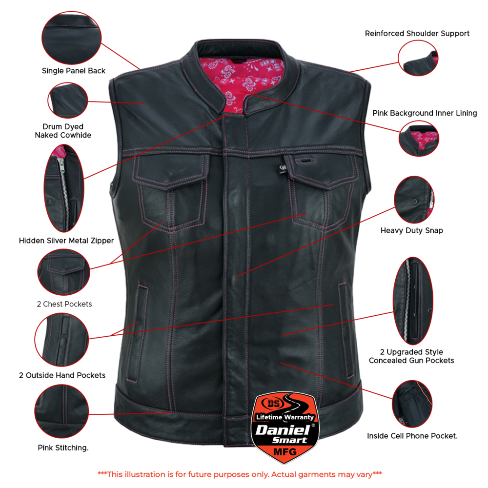- 2 upgraded style concealed gun pockets between the snap and the zipper made of special heavy-duty textile with built-in holsters and snap closure.