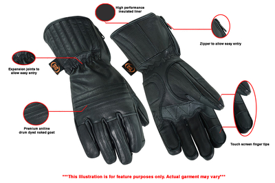 Men’s waterproof glove made in premium aniline drum dyed naked goat featuring high performance insulated liner for extra warmth, reflective piping, touch screen finger tips, zipper & expansion joints to allow easy entry to the gloves and a snug fit.