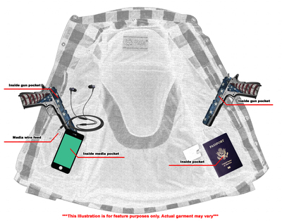 2 inside concealed gun pockets made of special heavy-duty textile with built-in holsters and snap closure and 1 regular inside pocket.