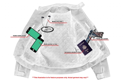 1 inside left-hand side concealed gun pockets made of special heavy-duty textile with built-in holsters and snap closure.