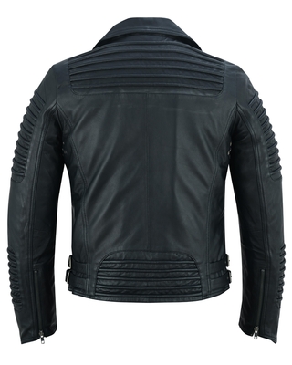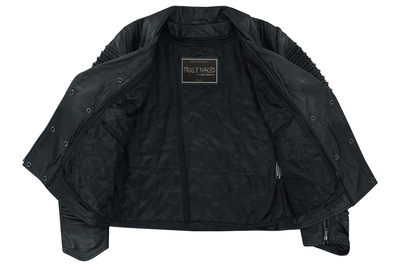 Our precisely crafted leather jacket blends optimal protection with rugged style, featuring specific leather thickness, ribbed accents, and adjustable belts.